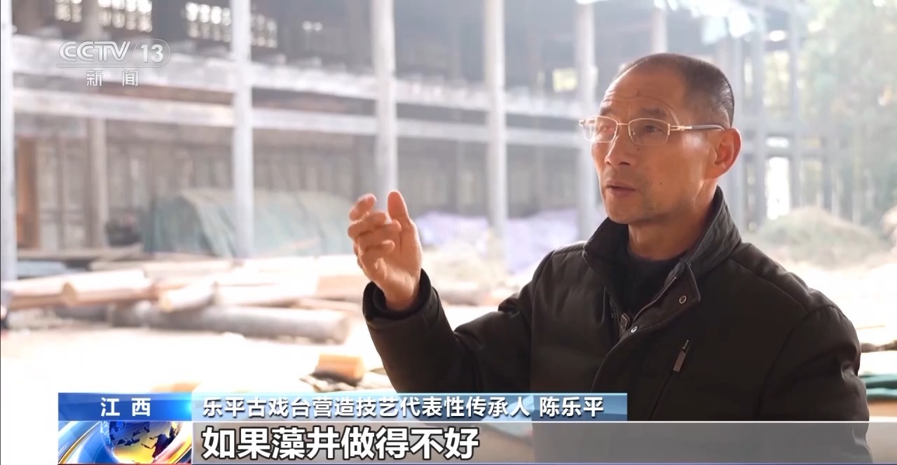 樂平古戲臺(tái)營(yíng)造技藝非遺傳承人 陳樂平:古代人做螺旋頂,做得越好的,回音就響亮。如果藻井做得不好,古代沒有擴(kuò)音器,做得不好回音就回不出來(lái)。