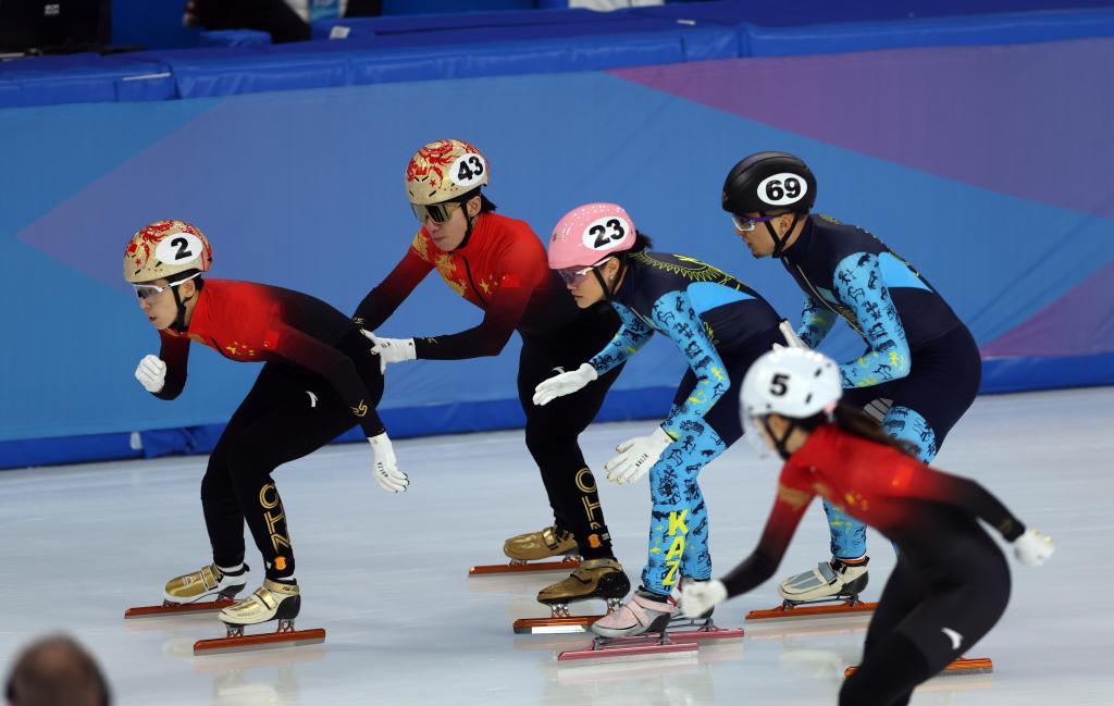 2月7日,中國隊(duì)選手范可新(左一)、林孝埈(左二)在比賽中交接棒。當(dāng)日,第九屆亞冬會短道速滑混合團(tuán)體2000米接力半決賽在哈爾濱舉行,中國隊(duì)晉級決賽。新華社記者 丁旭 攝
