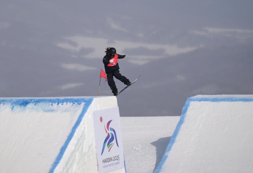 2月8日,張小楠在比賽中。當(dāng)日,在黑龍江亞布力舉行的第九屆亞冬會(huì)單板滑雪女子坡面障礙技巧決賽中,中國(guó)選手張小楠、熊詩(shī)芮包攬金銀牌。新華社記者 牟宇 攝