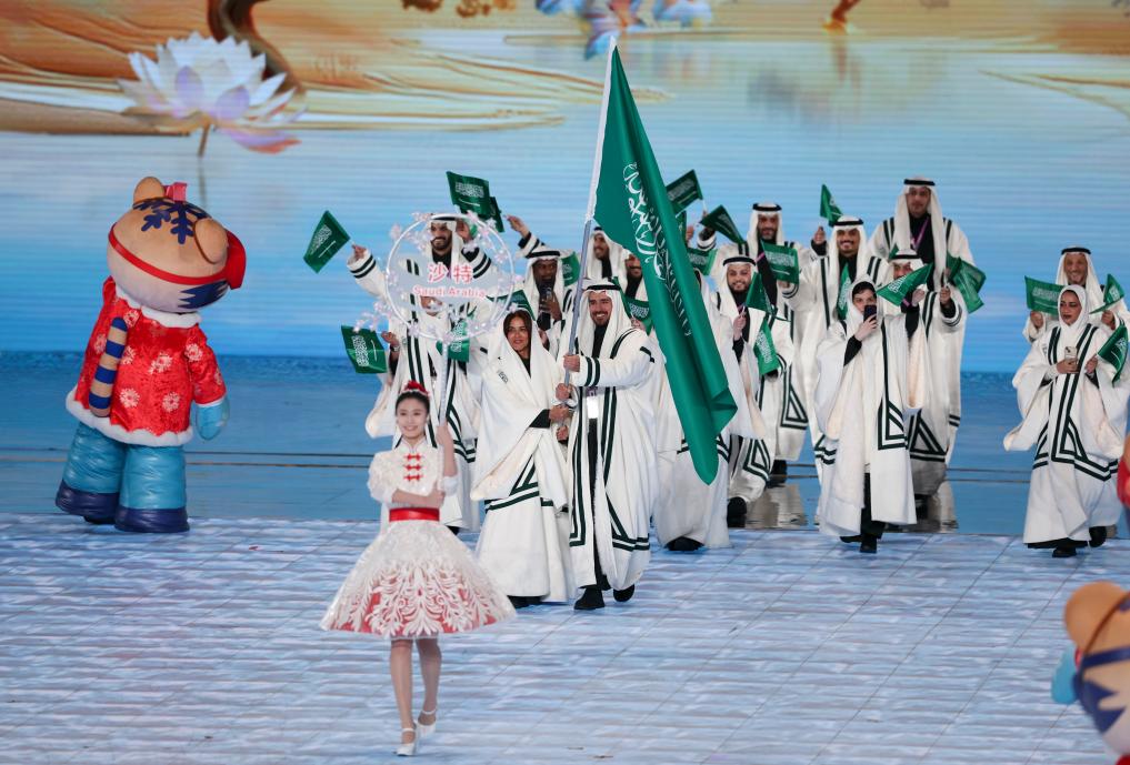 2月7日,沙特阿拉伯體育代表團(tuán)在第九屆亞洲冬季運(yùn)動(dòng)會(huì)開(kāi)幕式上入場(chǎng)。新華社記者 楊磊 攝