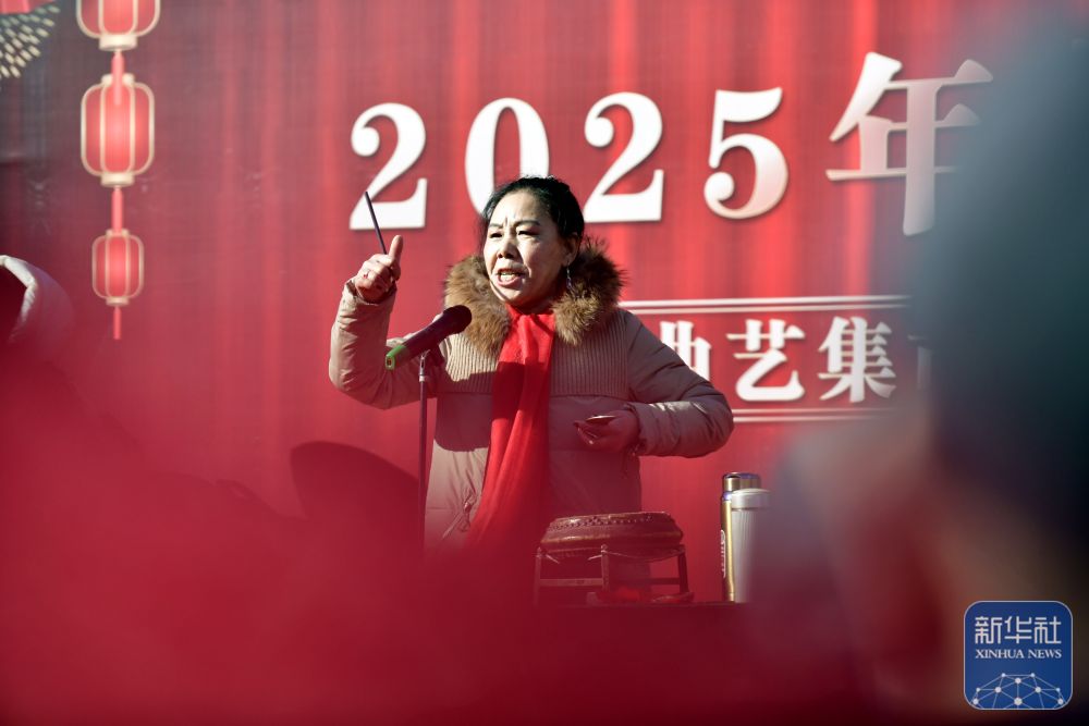 2月9日,河北省滄州市的曲藝藝人朱玉鳳在胡集書(shū)會(huì)上表演西河大鼓《羅成算卦》。