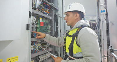 埃及工程師馬哈茂德·穆罕默德正在風機內(nèi)部進行電氣檢查。