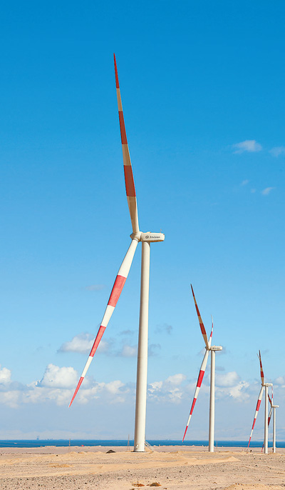 蘇伊士灣風電項目位于埃及首都開羅以南約300公里的蘇伊士灣西岸小鎮(zhèn)拉斯·加里卜。項目共有77臺風電機組,建成后預計每年可生產(chǎn)約27億千瓦時的清潔電力,實現(xiàn)二氧化碳減排約100萬噸。穆罕默德說:“在這片曠野上工作,把蘇伊士灣的風轉(zhuǎn)化成電能,‘點亮’萬家燈火,我感到十分驕傲?!?/p>