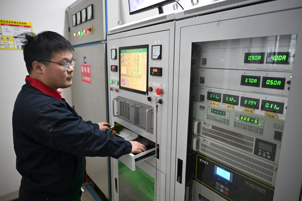 1月8日,在河南省科學(xué)院(沁陽)科創(chuàng)園,焦作同輻科技有限責(zé)任公司工作人員查看電子加速器系統(tǒng)運行狀態(tài)。