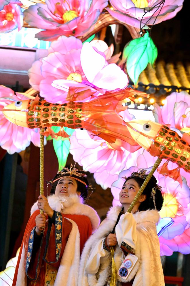 2月8日晚,身著傳統(tǒng)服飾的游人在河北省石家莊市正定榮國府影視基地內游園賞花燈。新華社發(fā)(陳其保攝)