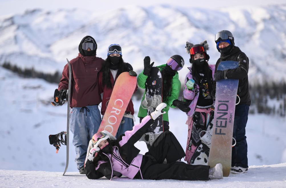 1月28日,來自浙江的“95后”姑娘張琦彬(前)與一起滑雪過年的同伴們?cè)谛陆⒗仗④娚絿H滑雪度假區(qū)合影。新華社記者 胡虎虎 攝