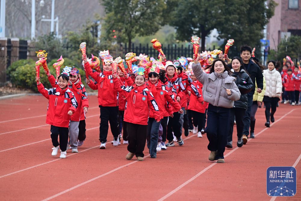 2月14日,合肥市園上園小學(xué)喻崗分校師生在開學(xué)典禮上進(jìn)行“貪吃蛇”接力跑活動。新華社記者 周牧 攝
