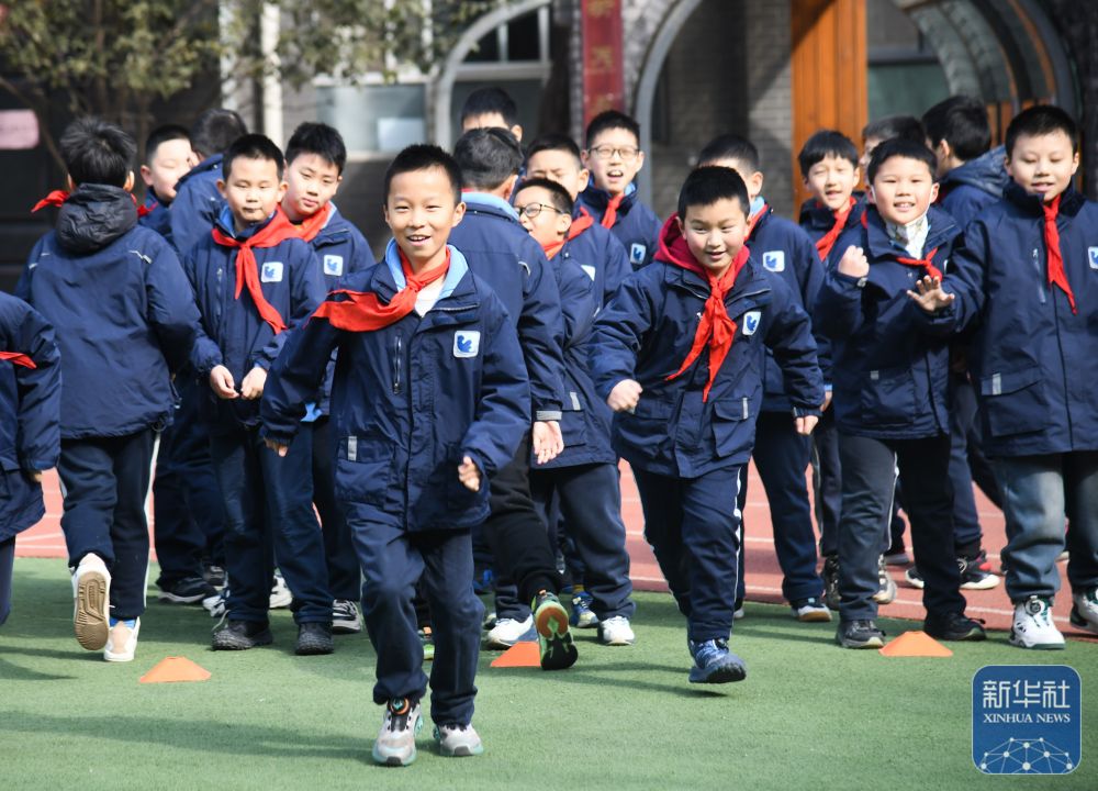 2月14日,西安市后宰門小學(xué)學(xué)生在體育課上進(jìn)行熱身活動。新華社記者 張博文 攝