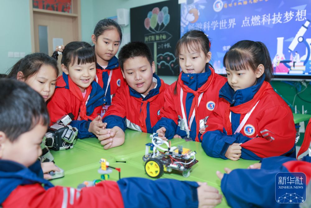 2月14日,在山東省棗莊市薛城區(qū)雙語實驗小學(xué),學(xué)生們與編程機(jī)器人互動。新華社發(fā)(王龍飛攝)