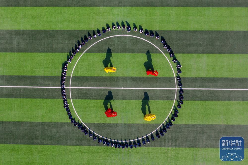 2月14日,山東省淄博科技學(xué)校龍獅社團(tuán)的學(xué)生在操場上進(jìn)行舞獅演練(無人機(jī)照片)。新華社發(fā)(張維堂攝)