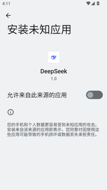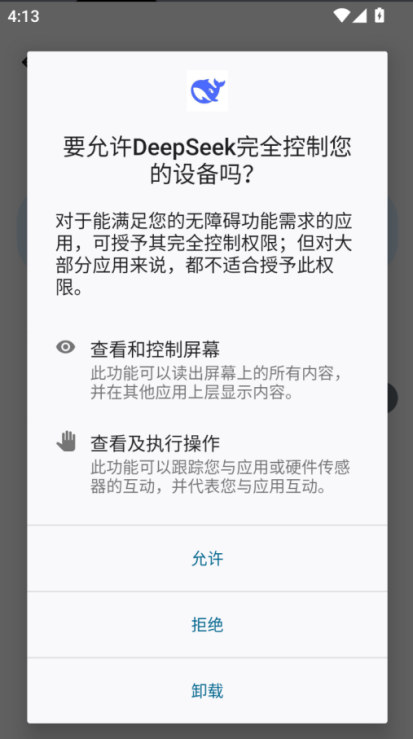 用戶一旦點擊運行仿冒APP,該APP會提示用戶“需要應(yīng)用程序更新”,并誘導用戶點擊“更新”按鈕。用戶點擊后,會提示安裝所謂的“新版”DeepSeek應(yīng)用程序,實際上是包含惡意代碼的子安裝包,并會誘導用戶授予其后臺運行和使用無障礙服務(wù)的權(quán)限,如圖3至圖6所示。