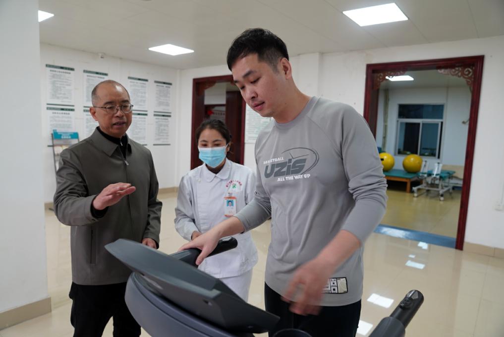 2月18日,韋軍在廣西南寧市西鄉(xiāng)塘區(qū)衡陽街道南鐵社區(qū)衛(wèi)生服務中心走訪,了解衛(wèi)生服務中心對群眾進行運動指導的情況。新華社記者 陳露緣 攝