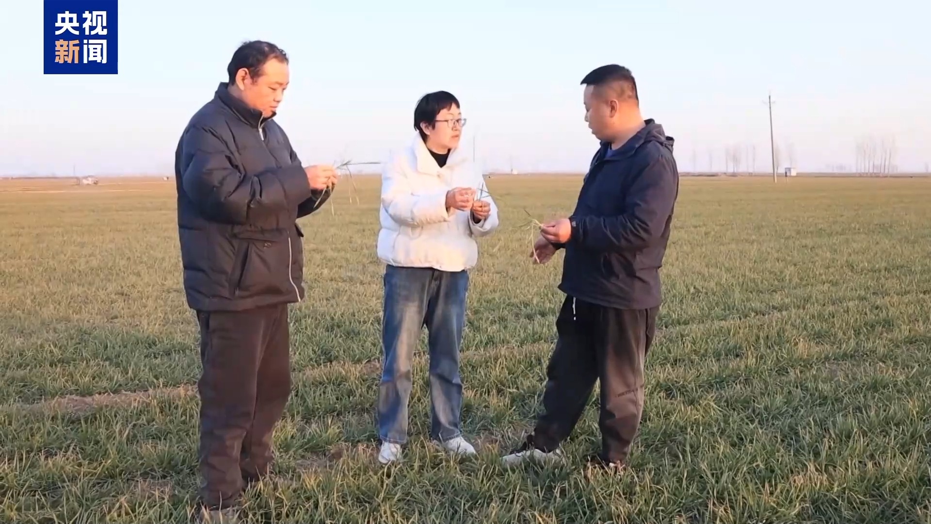 在山東煙臺招遠市一處麥田里,農技專家正仔細查看小麥的生長情況。