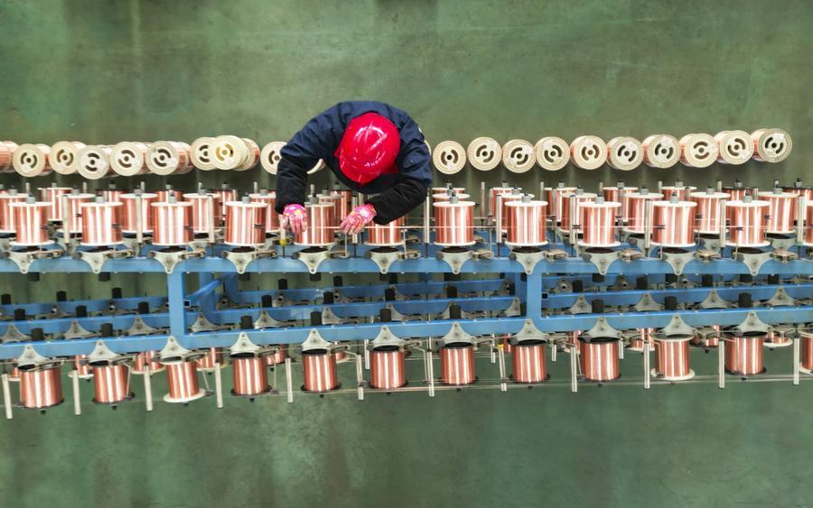 2月13日,在山東省東營市廣饒縣李鵲鎮(zhèn)的一家電纜公司的生產(chǎn)車間內(nèi),工人在進行束絲作業(yè)(無人機照片)。新華社發(fā)(劉云杰攝)