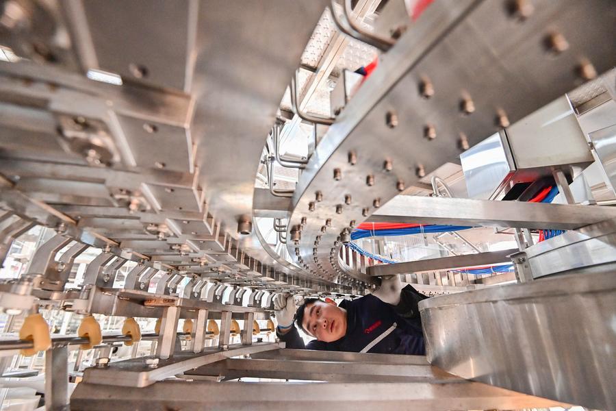 2月14日,在山東省青州經(jīng)濟開發(fā)區(qū)一家灌裝設備制造企業(yè),工人在車間內(nèi)裝配作業(yè)。新華社發(fā)(王繼林攝)