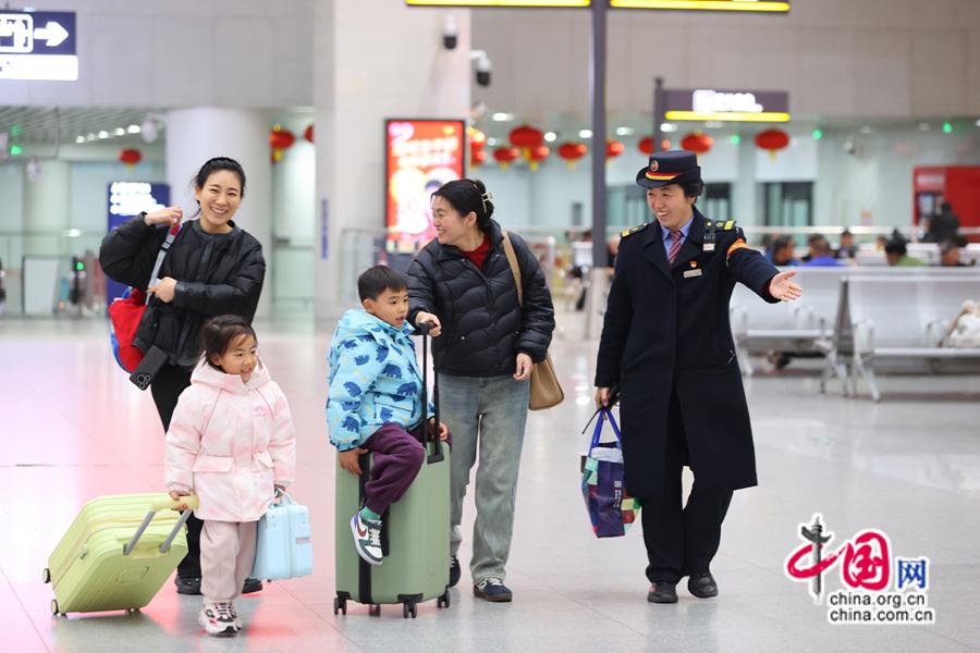 2025年春運(yùn)期間 ,南昌站工作人員為旅客指引候車(chē)位置。中國(guó)網(wǎng)發(fā) 劉慕/攝