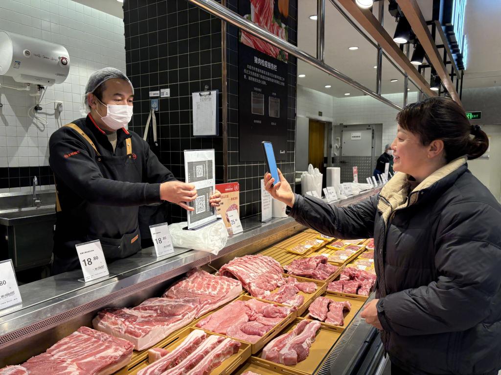 貴陽市一家豬肉生鮮門店內(nèi),消費(fèi)者手機(jī)掃碼查看相關(guān)產(chǎn)品信息。新華社記者 李凡 攝