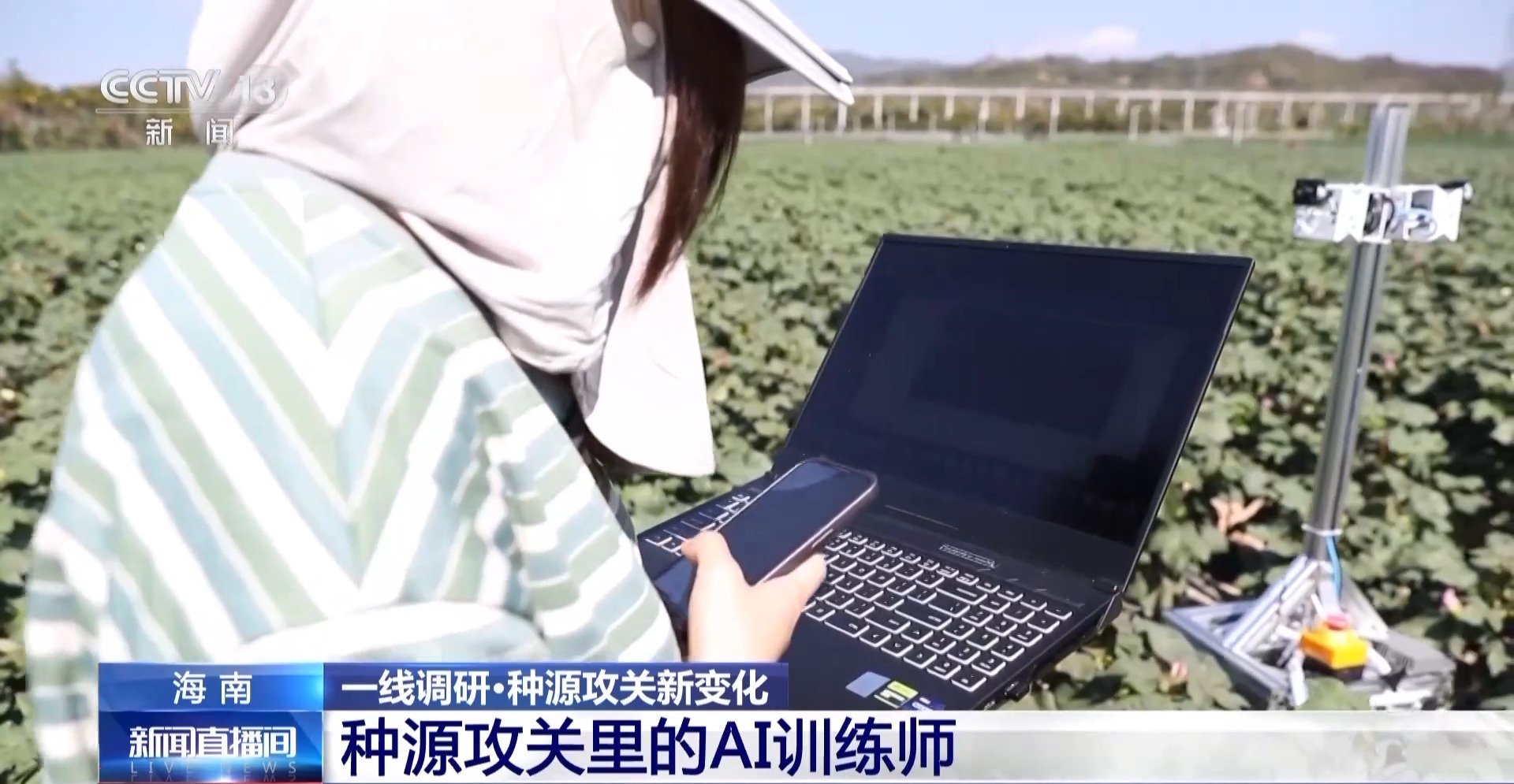 在南繁基地的這塊棉花田里,我們看到這樣的場(chǎng)景,一群年輕人在操作著機(jī)器人,帶著筆記本電腦,給棉花植株拍視頻。他們也被稱為農(nóng)田里的AI訓(xùn)練師。