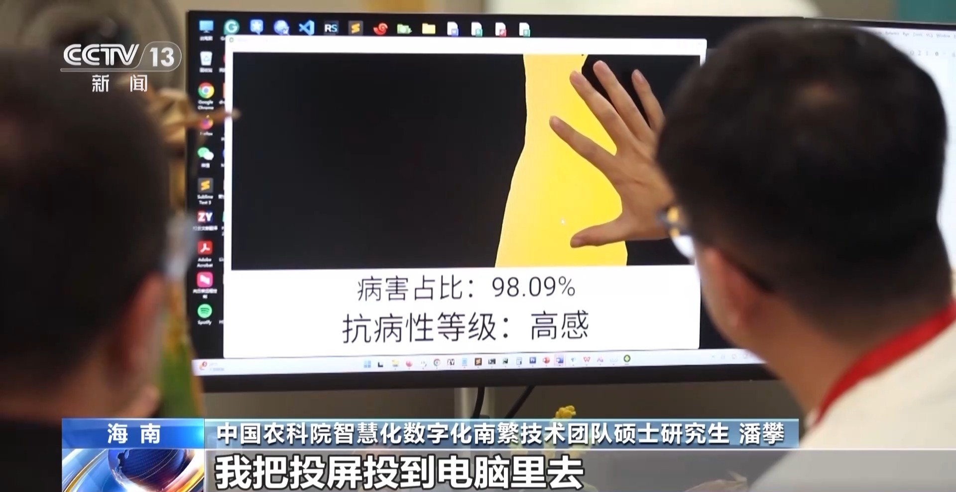 中國農(nóng)業(yè)科學(xué)院智慧化數(shù)字化南繁技術(shù)團(tuán)隊(duì)碩士研究生 潘攀:這上面的黃色的部分,就是有病害的部分,這個(gè)綠色的部分是,相當(dāng)于是沒有病害的部分。