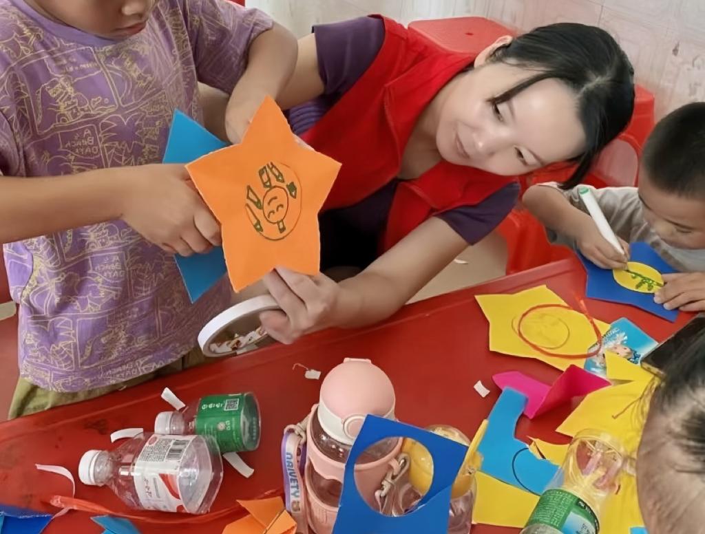 廣西南寧市武鳴區(qū)“愛心媽媽”志愿服務(wù)隊(duì)隊(duì)員與孩子一同做手工。新華社發(fā)