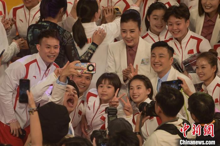 2024年8月30日,訪港的中國(guó)內(nèi)地奧運(yùn)健兒出席奧運(yùn)健兒大匯演。圖為香港藝人與奧運(yùn)健兒自拍?!≈行律缬浾?陳永諾 攝