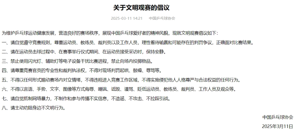 中國乒乓球協(xié)會11日在官網發(fā)布《關于文明觀賽的倡議》,其中提到理性看待輸贏、抵制網絡暴力等八項內容。