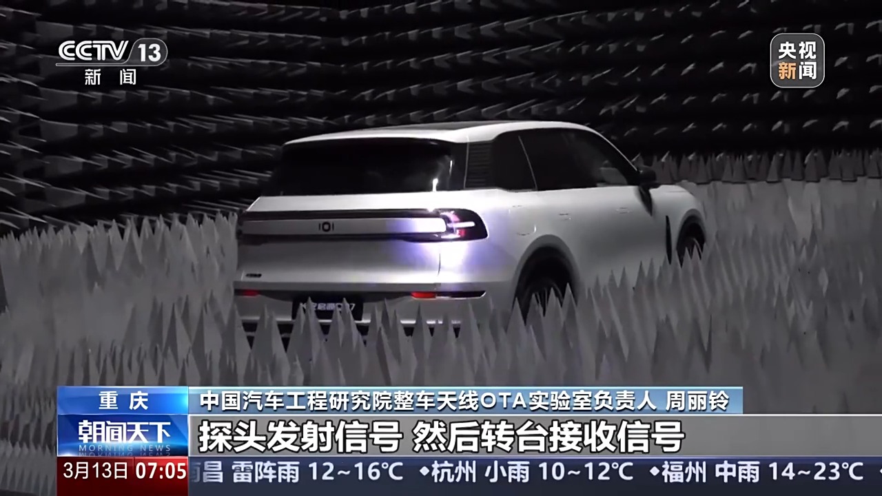 中國汽車工程研究院整車天線OTA實驗室負責人 周麗鈴:這里是我們的一個探頭,然后配我們的轉(zhuǎn)臺,探頭發(fā)射信號,然后轉(zhuǎn)臺接收信號,這樣的話就可以測汽車的接收性能,那它們互換一下就可以測汽車的一個發(fā)射的性能。