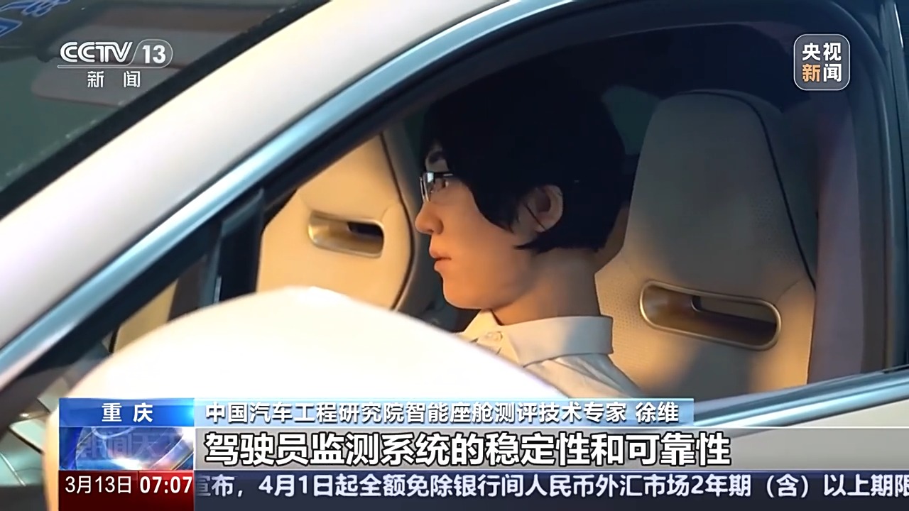中國汽車工程研究院智能座艙測評技術(shù)專家 徐維:這個仿生機器人可以去模擬駕駛員的一些手勢動作,同時可以模擬我們眨眼睛、微笑等一些微表情,從而快速去檢測我們駕駛員監(jiān)測系統(tǒng)的穩(wěn)定性和可靠性。
