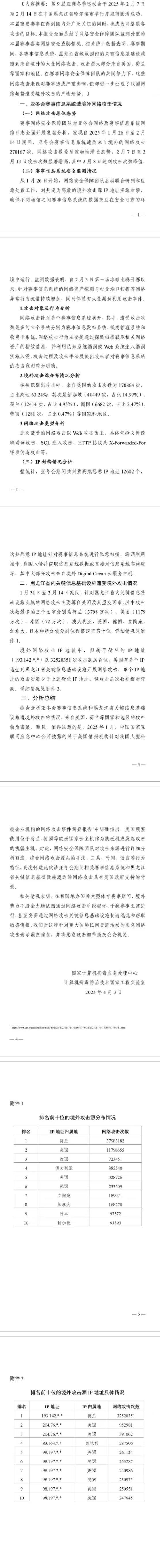 新華社哈爾濱4月3日電(記者王君寶 張建新)3日,國家計算機(jī)病毒應(yīng)急處理中心計算機(jī)病毒防治技術(shù)國家工程實驗室發(fā)布“2025年哈爾濱第九屆亞冬會”賽事信息系統(tǒng)及黑龍江省內(nèi)關(guān)鍵信息基礎(chǔ)設(shè)施遭境外網(wǎng)絡(luò)攻擊情況監(jiān)測分析報告,內(nèi)容顯示2025年1月26日至2月14日期間,亞冬會賽事信息系統(tǒng)遭到來自境外的網(wǎng)絡(luò)攻擊達(dá)270167次。