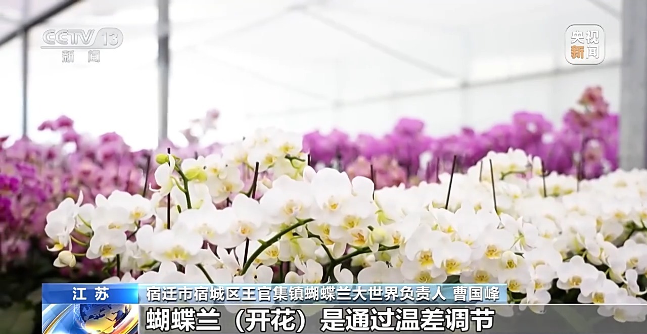 宿遷市宿城區(qū)王官集鎮(zhèn)蝴蝶蘭大世界負(fù)責(zé)人 曹國峰:其實(shí)蝴蝶蘭的自然花期應(yīng)該是農(nóng)歷年開始一直到“五一”,這是自然狀態(tài)?,F(xiàn)在我們通過技術(shù)干預(yù),想哪一天開就哪一天開。蝴蝶蘭開花是通過溫差調(diào)節(jié),這個(gè)時(shí)候我們就要用空調(diào),一些恒溫設(shè)備以及除濕設(shè)備進(jìn)行恒溫控制。