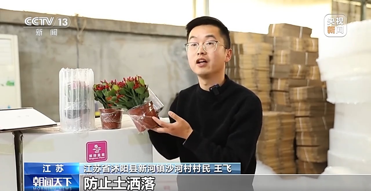 江蘇省沭陽縣新河鎮(zhèn)沙河村村民 王飛:我們先用保鮮膜鎖住盆里面的水分,防止土灑落,這樣的包裝可以讓花到買家手里時(shí)更新鮮一點(diǎn)。然后會(huì)用到防摔的氣柱,能保護(hù)花朵。
