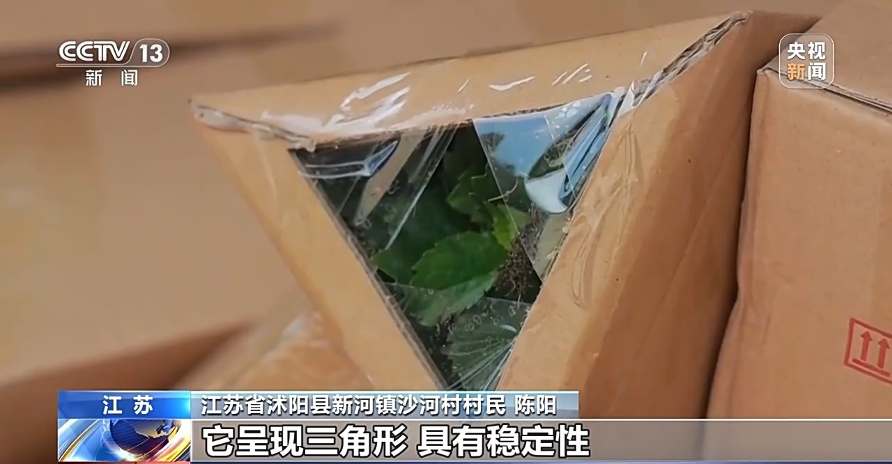 江蘇省沭陽縣新河鎮(zhèn)沙河村村民 陳陽:三角板是環(huán)保透氣性的材料,包裝完之后,它呈現(xiàn)三角形狀,具有穩(wěn)定性,植物不會(huì)受損傷。