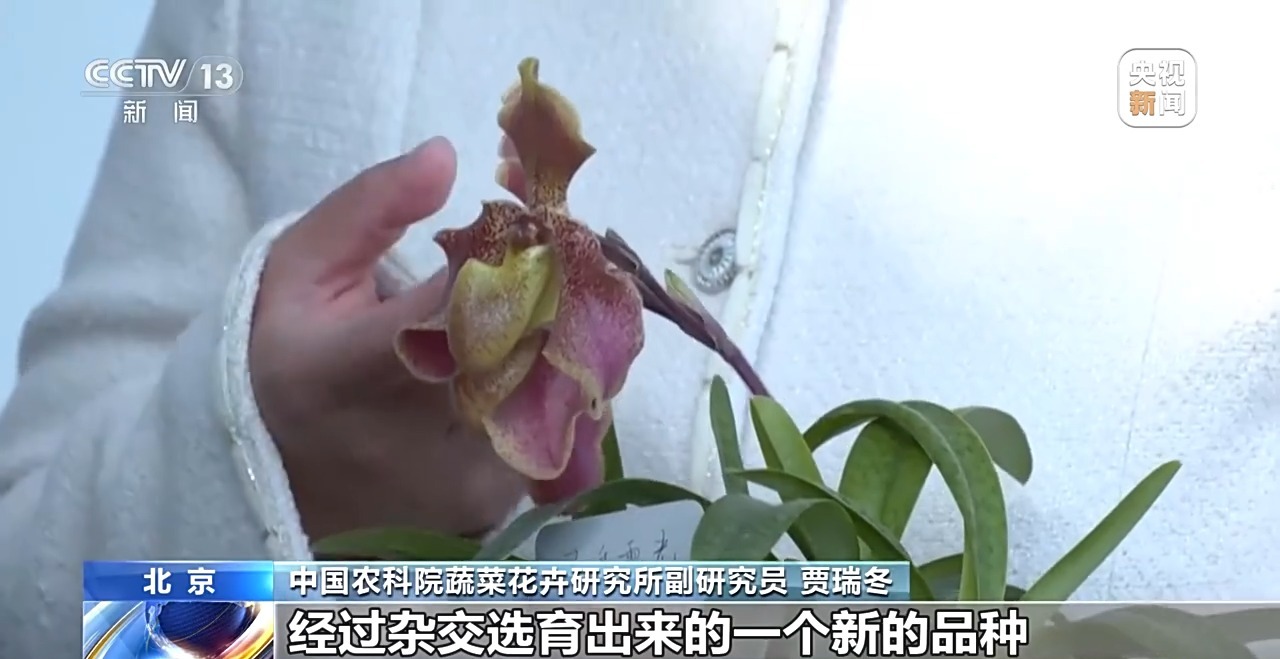 中國農(nóng)科院蔬菜花卉研究所副研究員 賈瑞冬:我們所做的工作就是怎么把物種繁殖利用起來。比如同色兜蘭和帶葉兜蘭經(jīng)過雜交選育出來的一個(gè)新的品種“靈秀霞光”,它的花兼具了同色兜蘭和帶葉兜蘭的優(yōu)點(diǎn),開不止一朵花,花瓣還比較厚,花比較大,花期會(huì)比較長。