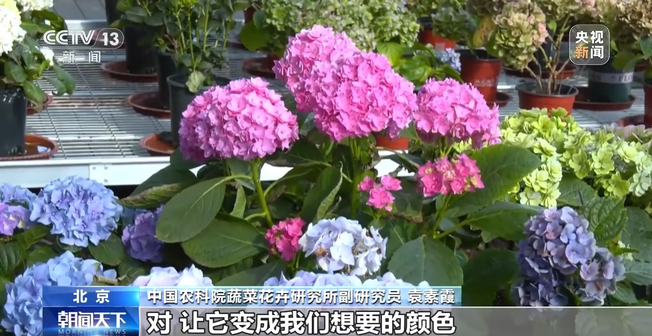 繡球被稱為植物中的變色龍,在中國農(nóng)科院的實(shí)驗(yàn)大棚里,粉色的花朵經(jīng)過科研人員的調(diào)控后,就會(huì)變成藍(lán)色稀有色,深受消費(fèi)者的喜愛。