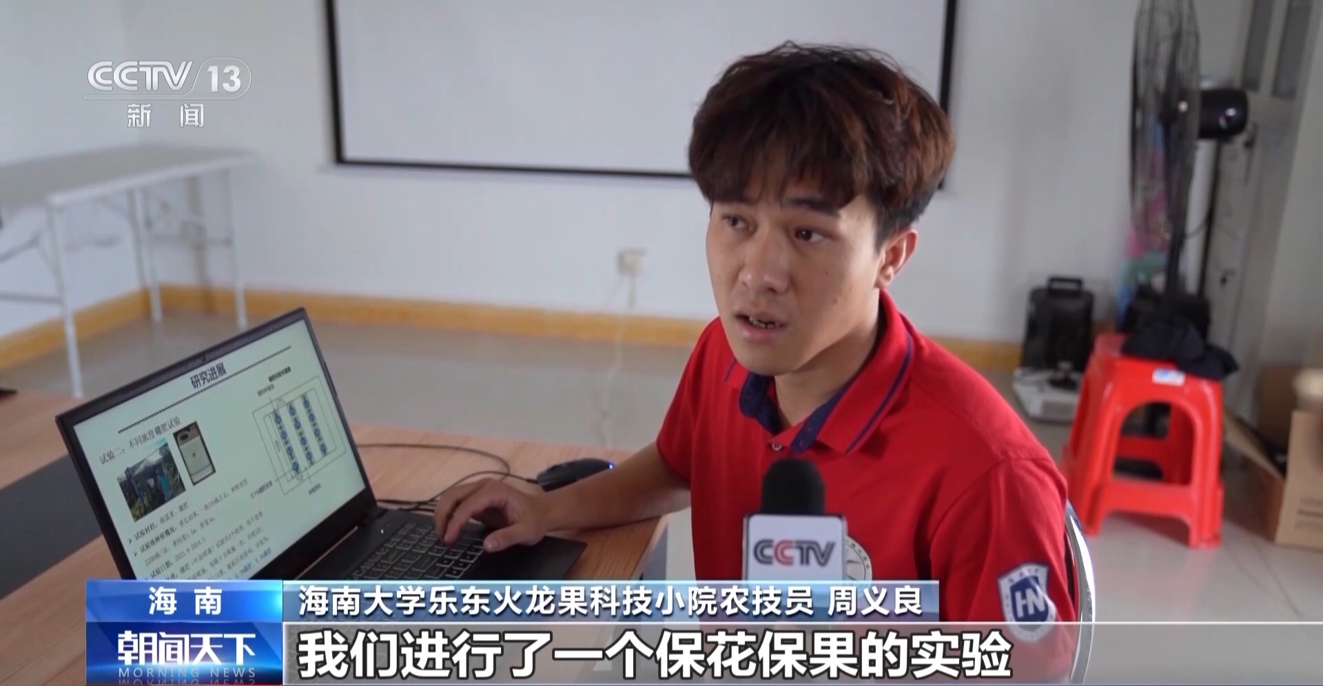 海南大學(xué)樂東火龍果科技小院農(nóng)技員 周義良:根據(jù)這個現(xiàn)狀,我們進(jìn)行了一個?;ū9膶?shí)驗,通過不同濃度的硼肥、氨基酸肥、授粉和溫度調(diào)控來進(jìn)行實(shí)驗,坐果率提升了20%左右。