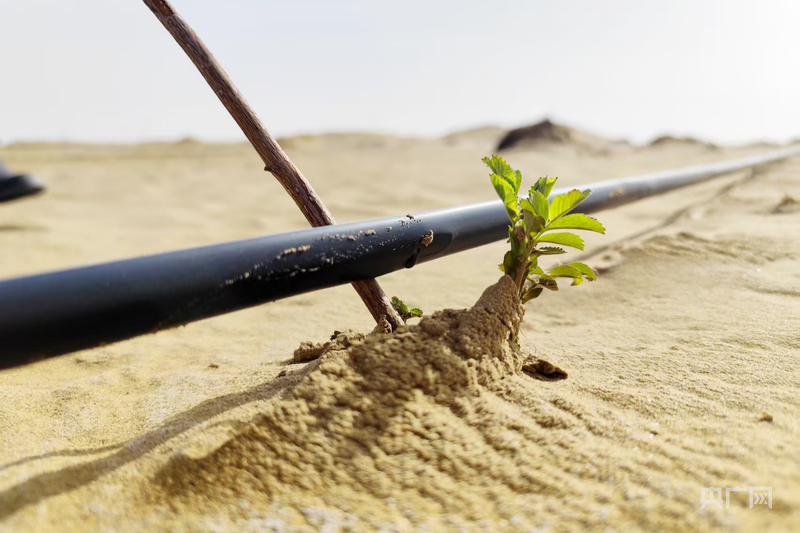 數(shù)臺(tái)推土機(jī)以磅礴之勢(shì)推平連綿沙丘,為綠色的希望開辟道路;林草技術(shù)中心的技術(shù)人員與護(hù)林員協(xié)作栽種耐旱中草藥苗,每個(gè)動(dòng)作都飽含著對(duì)這片沙地的期待;去年完成塔克拉瑪干鎖邊合龍的區(qū)域,沙漠玫瑰沖破沙層露出新芽;滴灌帶的水滴有序落下,滋潤(rùn)著這片干涸的沙漠,像一條條生命的脈絡(luò)延伸在廣袤沙?!?/p>