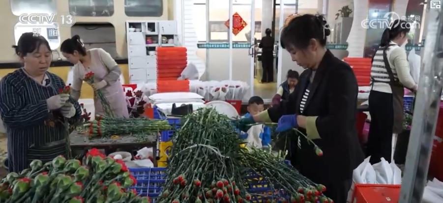 在昆明一家花卉貿(mào)易公司,記者看到,工人們正加班加點(diǎn)對(duì)剛剛集中采購(gòu)回來(lái)的康乃馨進(jìn)行二次分級(jí)包裝。
