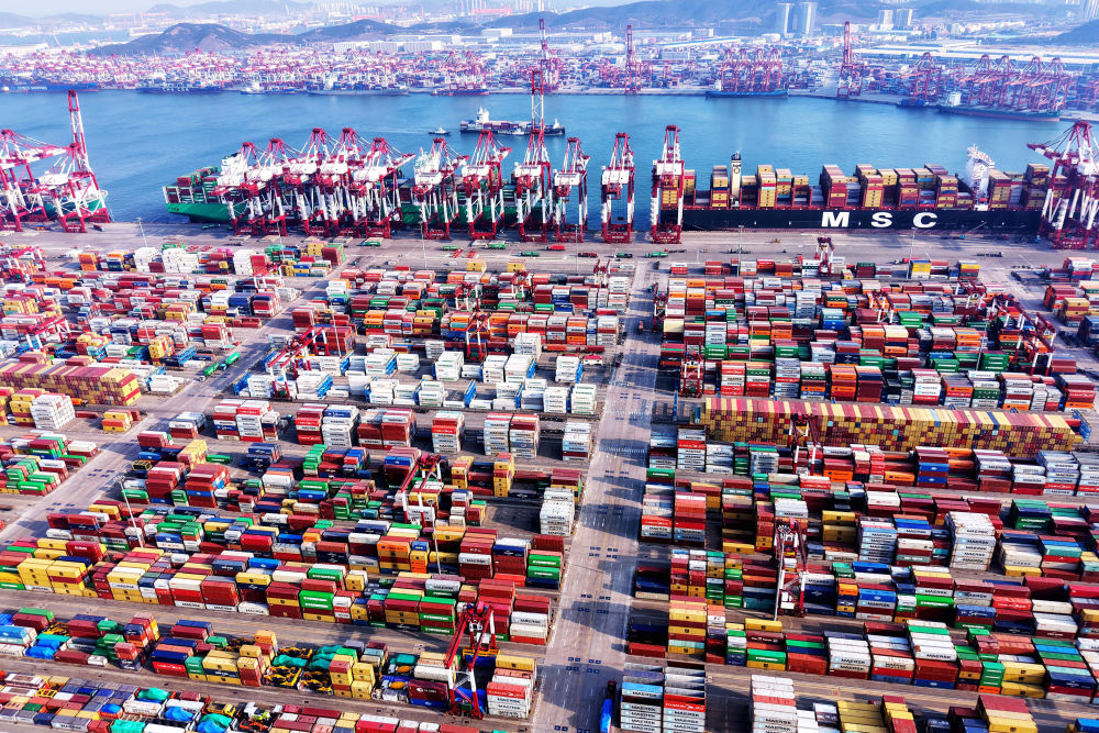 這是2月23日拍攝的山東港口青島港外貿(mào)集裝箱碼頭(無(wú)人機(jī)照片)。2025年以來(lái),青島港開(kāi)通2條到東南亞、地中海方向的“一帶一路”航線,合計(jì)新開(kāi)4條國(guó)際集裝箱航線,加快世界一流海洋港口建設(shè)。新華社發(fā)(俞方平 攝)