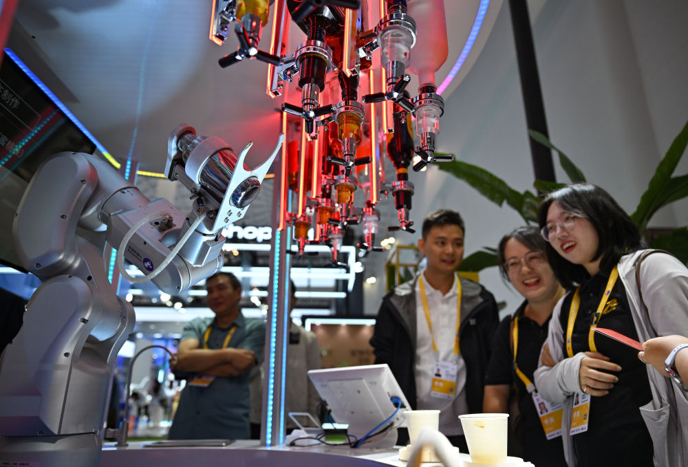 4月14日,消博會(huì)上展示的一款機(jī)器人在調(diào)酒。