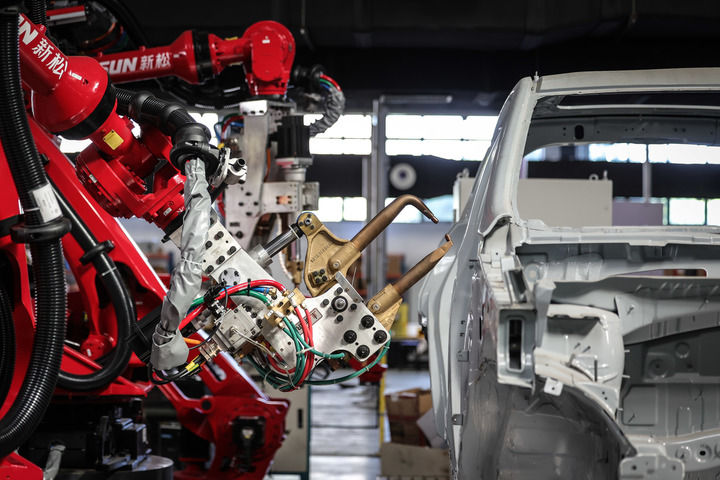 2024年6月3日拍攝的點焊機器人。機器人被廣泛應用于工業(yè),它們能夠勝任繁重、危險或復雜的工作,提高生產效率和經濟效益。新華社記者 潘昱龍 攝
