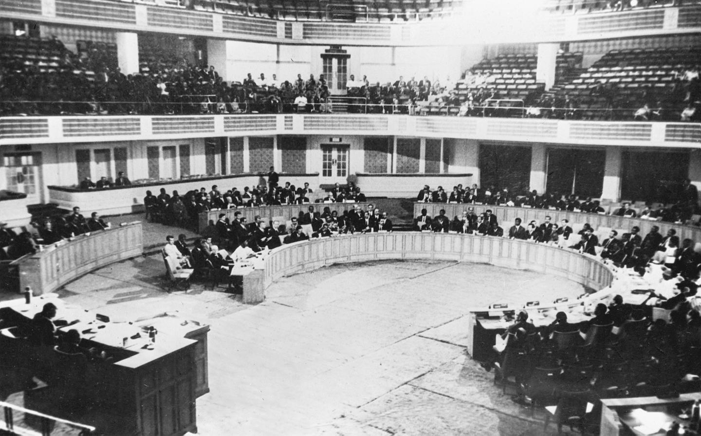 1955年4月18日至24日,29個(gè)亞非國家和地區(qū)的政府代表團(tuán)在印度尼西亞萬隆召開亞非會(huì)議。圖為萬隆亞非會(huì)議會(huì)場(chǎng)內(nèi)景。新華社記者錢嗣杰攝