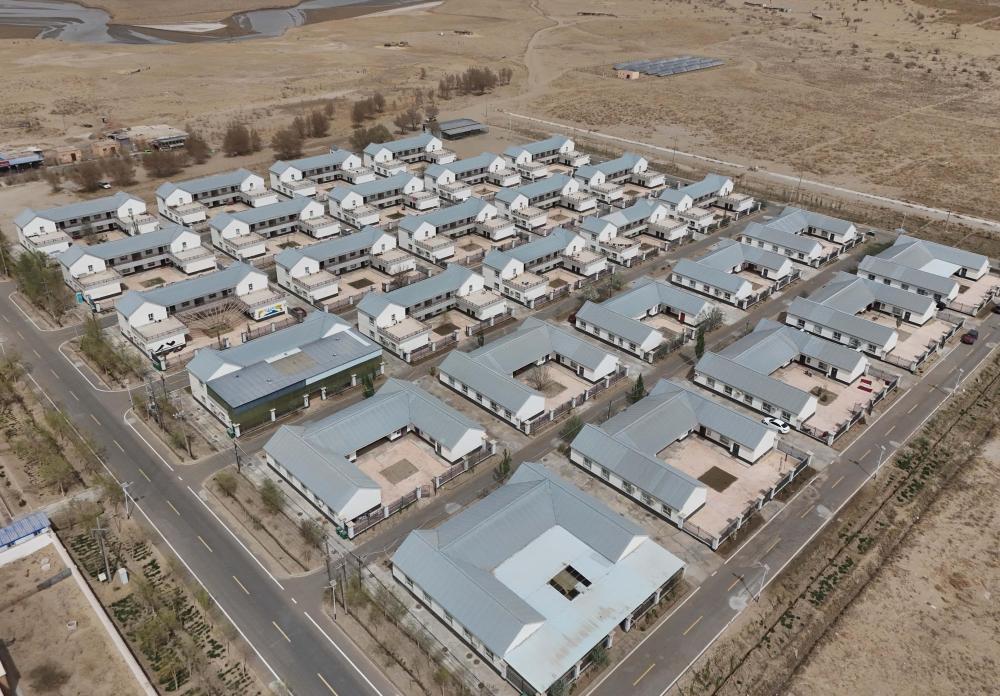 新疆于田縣達(dá)里雅布依鄉(xiāng)新村“藏身”于這片沙海。民房齊整氣派,不遠(yuǎn)處就是高大延綿的沙丘。