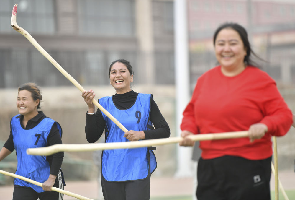 39歲的阿依古麗·買(mǎi)托合提是球隊(duì)里最年長(zhǎng)的隊(duì)員。她身穿皮衣、腳踏休閑鞋,奔跑在正午驕陽(yáng)下,屢屢揮動(dòng)球桿,拼搶也毫不遜色。一起訓(xùn)練的隊(duì)友有人穿著牛仔褲,有人穿著襯衫,還有人穿著后跟略高的鞋子。紅色的球洞穿由兩個(gè)塑料水瓶組成的球門(mén),得分的一方歡呼不已,失球的隊(duì)員則懊惱地擦去臉上的沙塵。