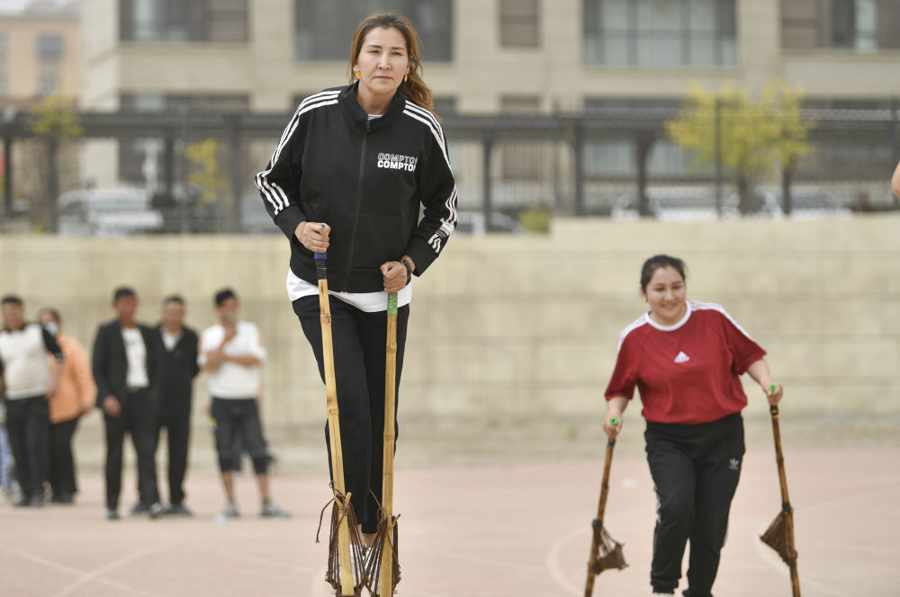 運動場上,柔鮮古麗一改治沙時的“防守”姿態(tài),勇往直前。為期三天的比賽中,場邊觀戰(zhàn)的女兒一邊隨她奔跑,一邊賣力地為母親加油助威,柔鮮古麗拿下了100米和200米的全縣高腳競速比賽冠軍。