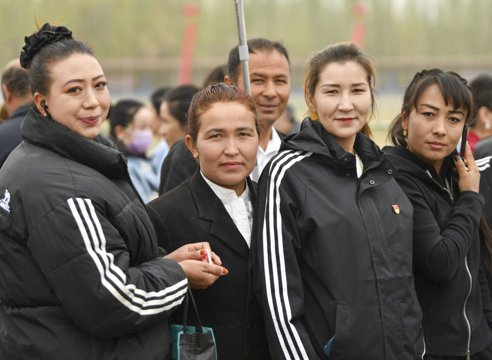 柔鮮古麗(右二)和奧依托格拉克鄉(xiāng)的村民在一起。新華社記者胡虎虎攝