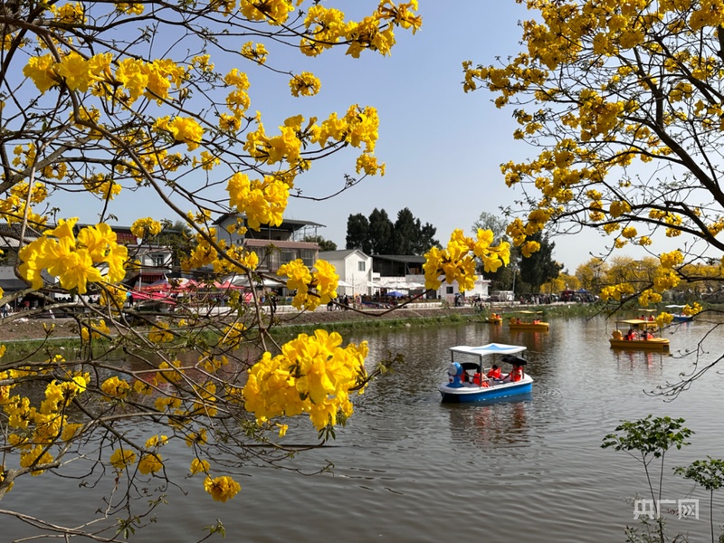 四月芳菲盛,踏青正當時。近日,四川省簡陽市東麓花溪的千畝黃花風鈴木迎來盛花期,金黃花海不僅吸引八方游客紛至沓來,更催生出多元消費新場景,讓“鮮花經(jīng)濟”綻放出獨特魅力。