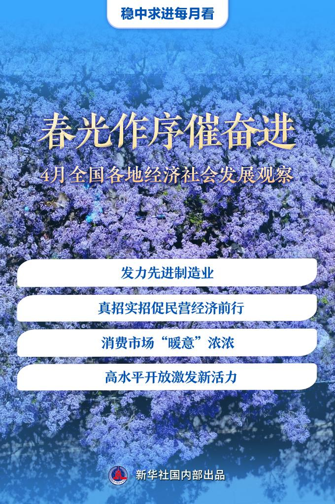 人間四月,春和景明。先進制造業(yè)發(fā)展步伐加快、多措并舉促民營經(jīng)濟高質(zhì)量發(fā)展、春日消費持續(xù)升溫、高水平開放激發(fā)新的經(jīng)濟活力……今年4月以來,我國經(jīng)濟呈現(xiàn)向好態(tài)勢,春光作序,高質(zhì)量發(fā)展扎實推進。