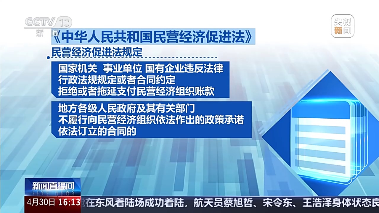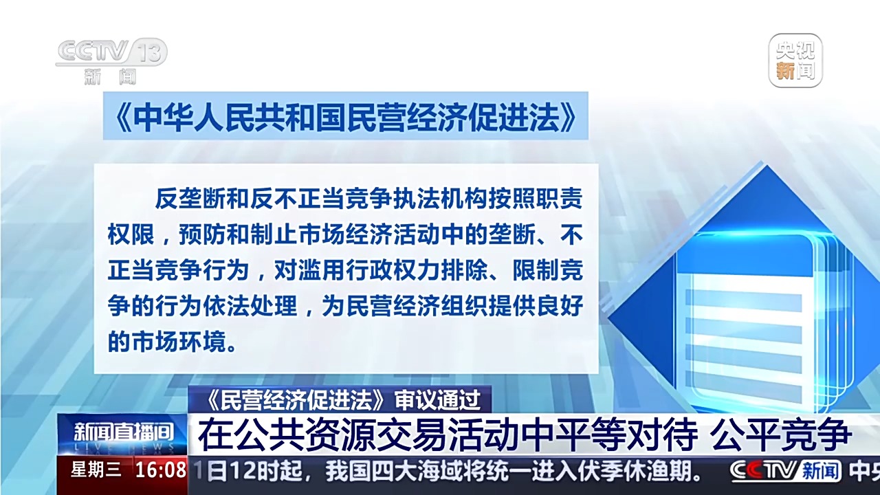 全國人大常委會法工委經(jīng)濟法室主任 楊合慶:制定民營經(jīng)濟促進法,第一次將“毫不動搖鞏固和發(fā)展公有制經(jīng)濟,毫不動搖鼓勵、支持、引導非公有制經(jīng)濟發(fā)展”“促進民營經(jīng)濟健康發(fā)展和民營經(jīng)濟人士健康成長”寫入法律,第一次明確民營經(jīng)濟的法律地位,第一次明確規(guī)定促進民營經(jīng)濟持續(xù)、健康、高質(zhì)量發(fā)展,是國家長期堅持的重大方針政策。