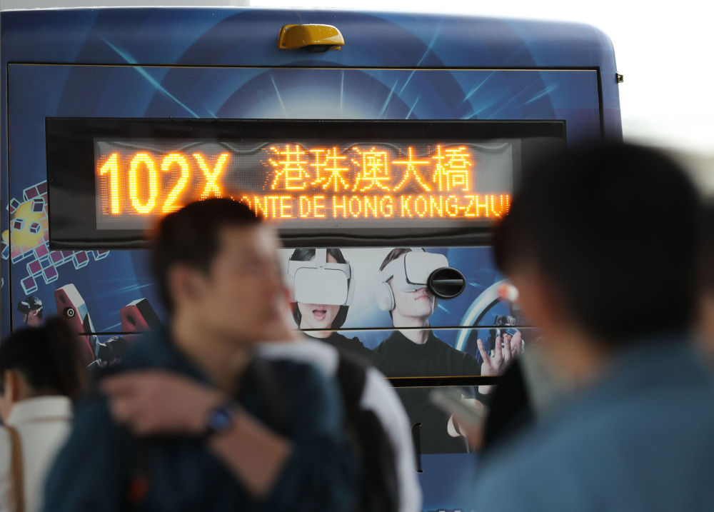 市民和旅客在橫琴口岸澳門(mén)口岸區(qū)排隊(duì),準(zhǔn)備登上前往港珠澳大橋方向的公交車。新華社記者 王益亮 攝