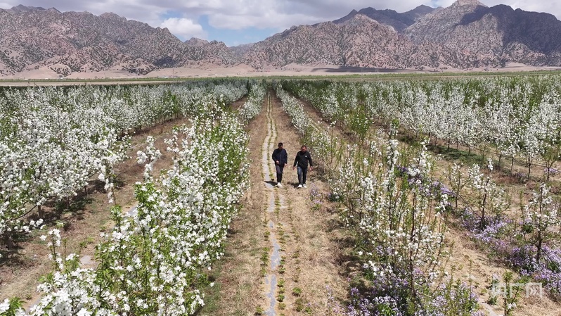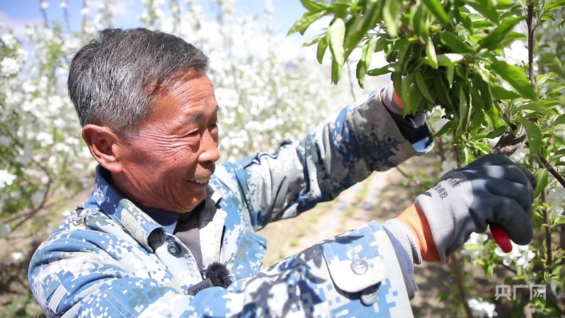 步入內(nèi)蒙古巴彥淖爾市烏拉特前旗白彥花鎮(zhèn)塔漢其嘎查林果產(chǎn)業(yè)園,大片果樹迎來最美花期,微風(fēng)拂過,花香沁人心脾,果園里村民高忠標正專注地修剪著果樹?!拔医衲?0多歲了,在這里打工五六年了,一個月能掙五六千塊錢,挺好的?!?/p>
